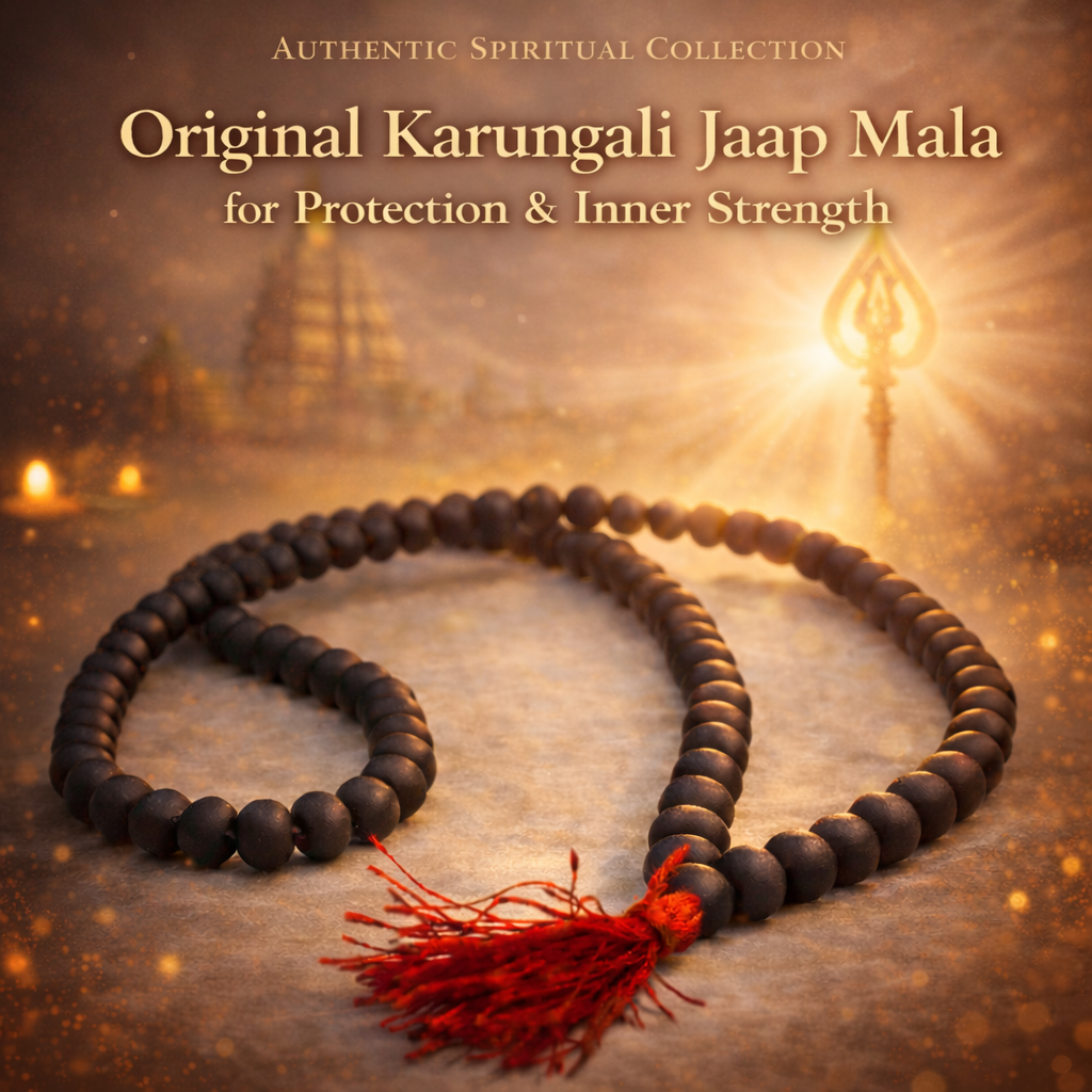 The Karungali Malai (108 Beads) is crafted from rare Ebony Wood, also known as Karungali, a sacred wood from South India believed to carry powerful protective and spiritual energies. Worn by saints and yogis for centuries, this mala shields the wearer from negative energies, evil eye, and misfortune, while inviting positivity, focus, and divine blessings.